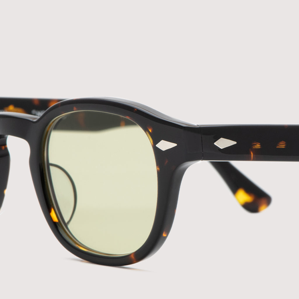 ブラックベースのベッコウフレームは、高級感がありブラウンベースのベッコウよりもインパクトのある仕上がりで、日光下でのフレームのカラーの抜けが美しく、またブランドの人気レンズ、UV化で変色する調光レンズを新たに染色したイエロー調光レンズもダークグレーへと変化する唯一無二のニューカラー。