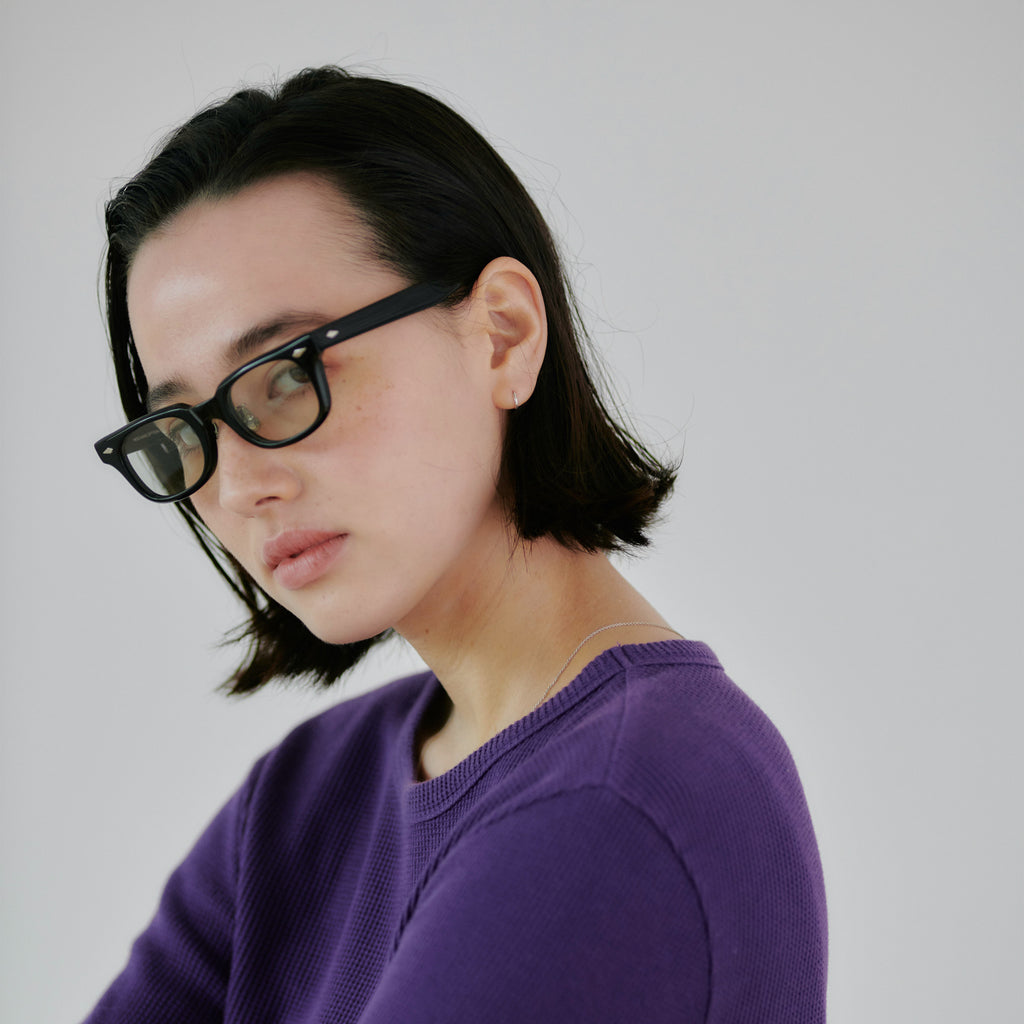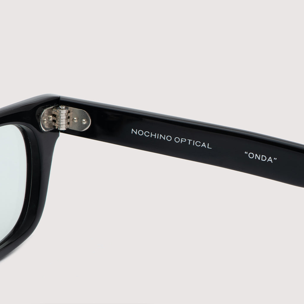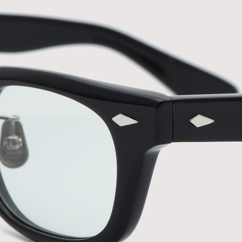 これまでのNOCHINOコレクションの中でも90年代カルチャーのテイストがある上下幅が狭いシェイプながらも普遍的な’’らしさ’’を出す為に6mm厚フロントには程よい「甲丸感/コウマルカン」。ビンテージ界隈でアリとされているフロントとサイドの段差を敢えて行わず、全てを組み立てた後に、さらに磨き合わせる’’面合わせ/ツラアワセ’’という一手間をかける事で繋がりのある一体感と斜めから見た有機的な光沢を具現化。またテンプルと呼ばれる耳に当たる部分の4mm厚のプラステックにはシューティング技法と呼ばれる昔ながらの方法で鯖江の熟練された専属職人が1本1本手作業でメタル芯を内包し、調整や経年変化防止の役目を担っております。