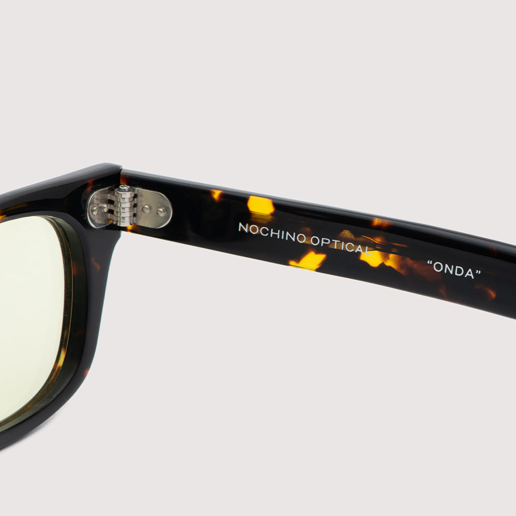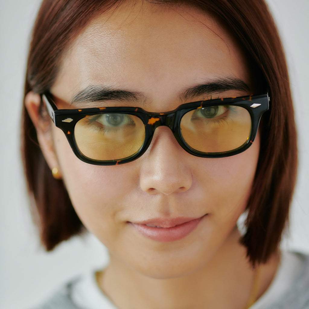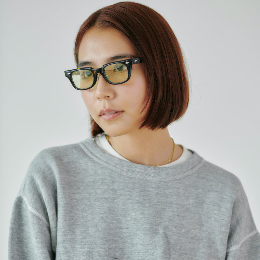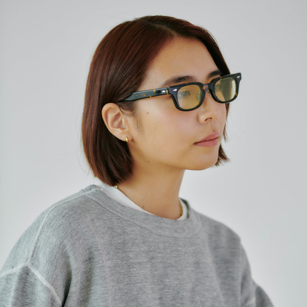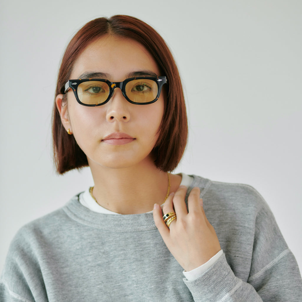 これまでのNOCHINOコレクションの中でも90年代カルチャーのテイストがある上下幅が狭いシェイプながらも普遍的な’’らしさ’’を出す為に6mm厚フロントには程よい「甲丸感/コウマルカン」。ビンテージ界隈でアリとされているフロントとサイドの段差を敢えて行わず、全てを組み立てた後に、さらに磨き合わせる’’面合わせ/ツラアワセ’’という一手間をかける事で繋がりのある一体感と斜めから見た有機的な光沢を具現化。またテンプルと呼ばれる耳に当たる部分の4mm厚のプラステックにはシューティング技法と呼ばれる昔ながらの方法で鯖江の熟練された専属職人が1本1本手作業でメタル芯を内包し、調整や経年変化防止の役目を担っております。