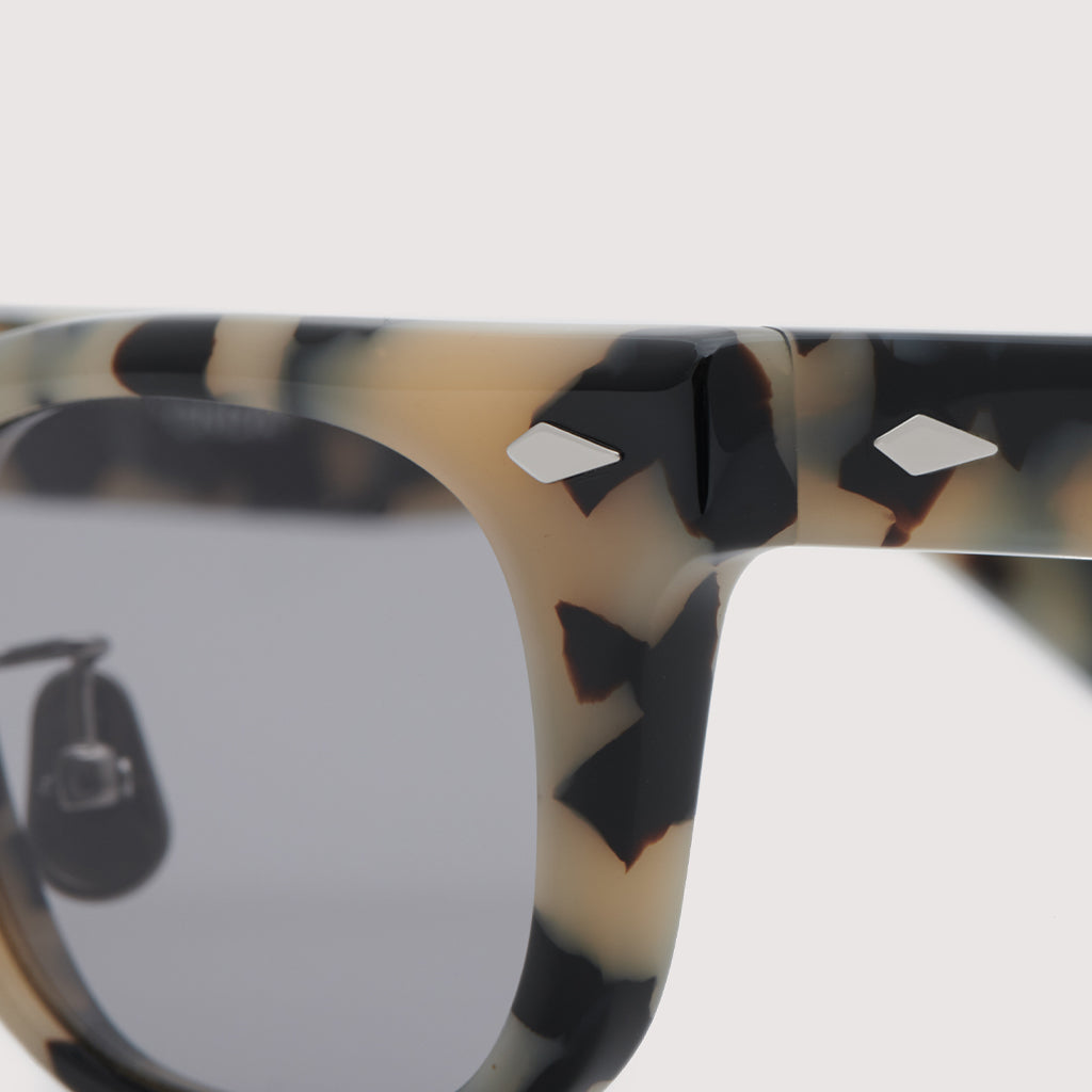 これまでのNOCHINOコレクションの中でも90年代カルチャーのテイストがある上下幅が狭いシェイプながらも普遍的な’’らしさ’’を出す為に6mm厚フロントには程よい「甲丸感/コウマルカン」。ビンテージ界隈でアリとされているフロントとサイドの段差を敢えて行わず、全てを組み立てた後に、さらに磨き合わせる’’面合わせ/ツラアワセ’’という一手間をかける事で繋がりのある一体感と斜めから見た有機的な光沢を具現化。またテンプルと呼ばれる耳に当たる部分の4mm厚のプラステックにはシューティング技法と呼ばれる昔ながらの方法で鯖江の熟練された専属職人が1本1本手作業でメタル芯を内包し、調整や経年変化防止の役目を担っております。
