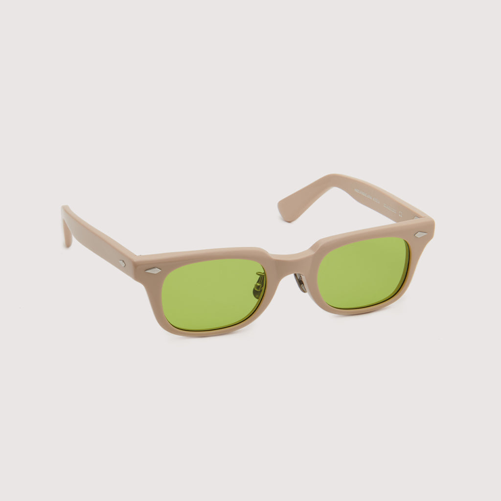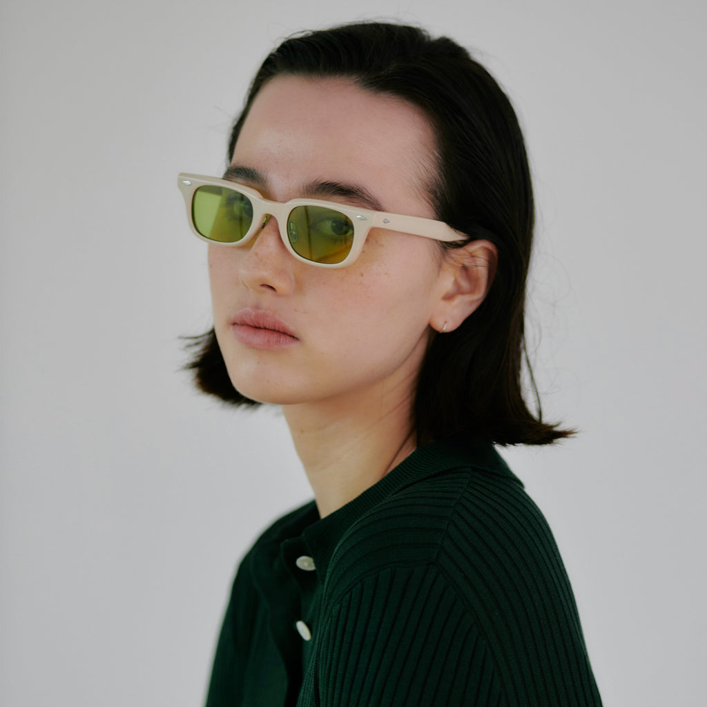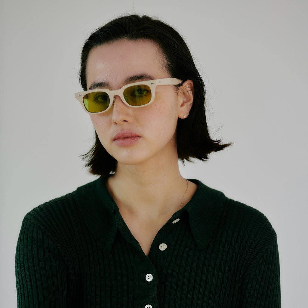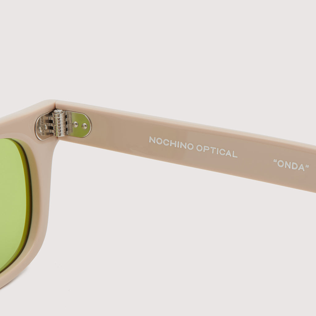 これまでのNOCHINOコレクションの中でも90年代カルチャーのテイストがある上下幅が狭いシェイプながらも普遍的な’’らしさ’’を出す為に6mm厚フロントには程よい「甲丸感/コウマルカン」。ビンテージ界隈でアリとされているフロントとサイドの段差を敢えて行わず、全てを組み立てた後に、さらに磨き合わせる’’面合わせ/ツラアワセ’’という一手間をかける事で繋がりのある一体感と斜めから見た有機的な光沢を具現化。またテンプルと呼ばれる耳に当たる部分の4mm厚のプラステックにはシューティング技法と呼ばれる昔ながらの方法で鯖江の熟練された専属職人が1本1本手作業でメタル芯を内包し、調整や経年変化防止の役目を担っております。