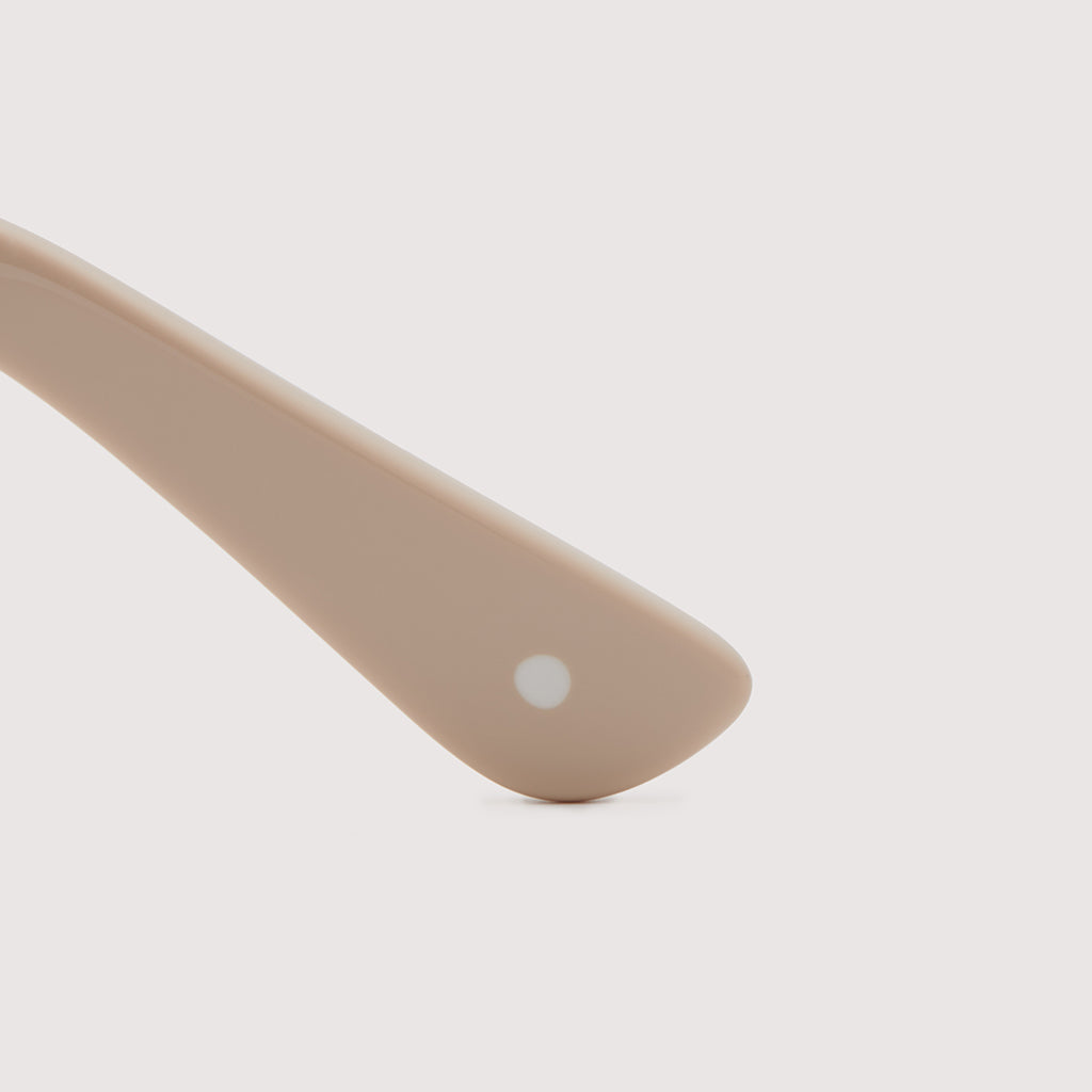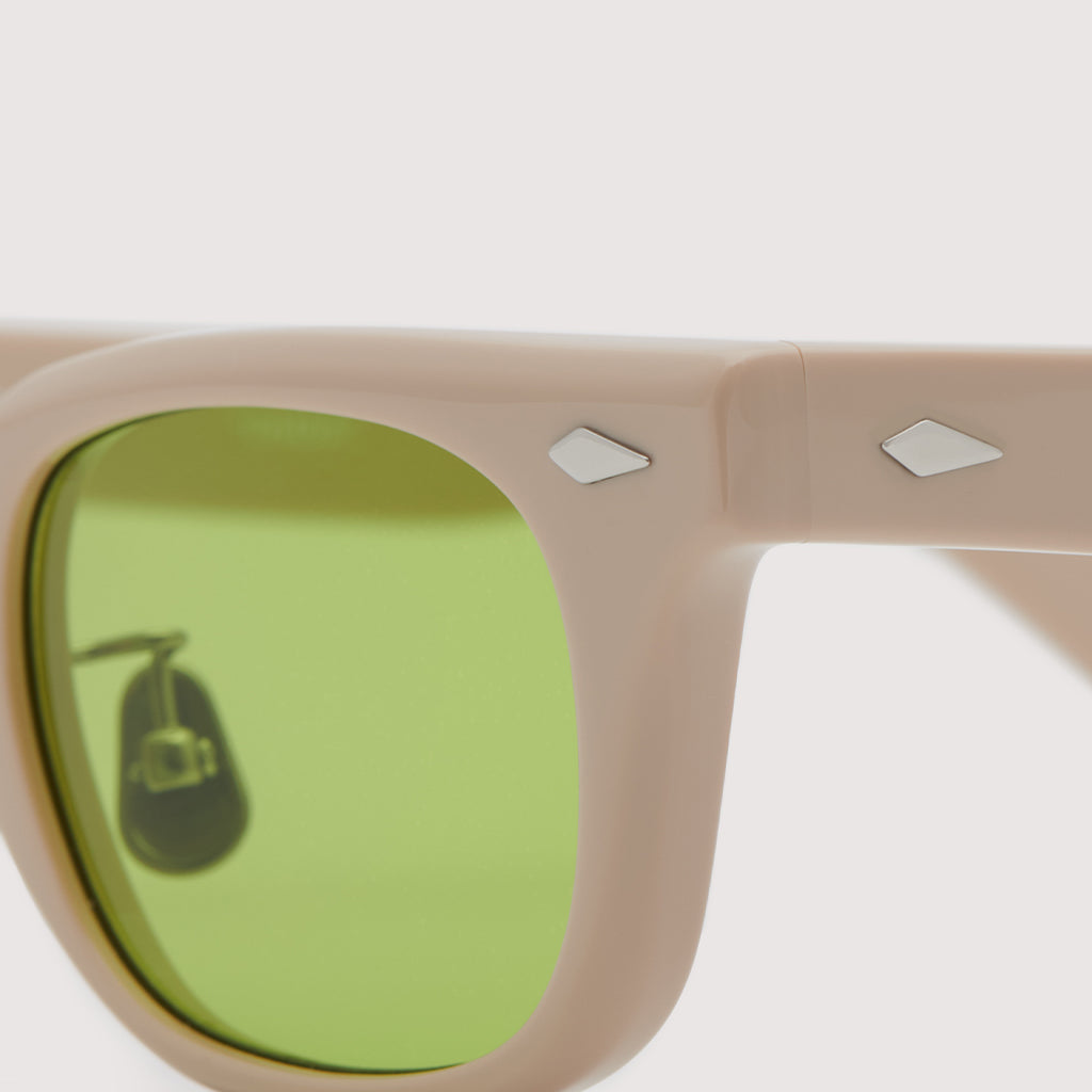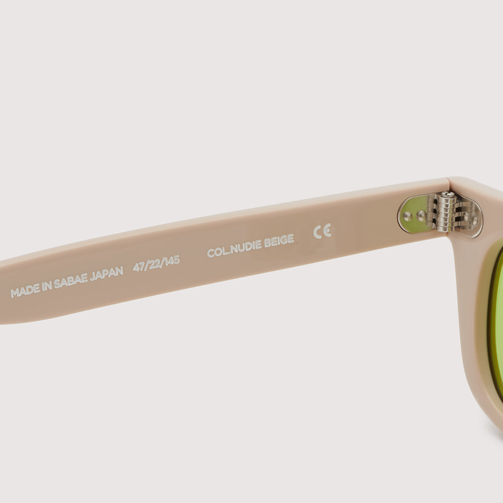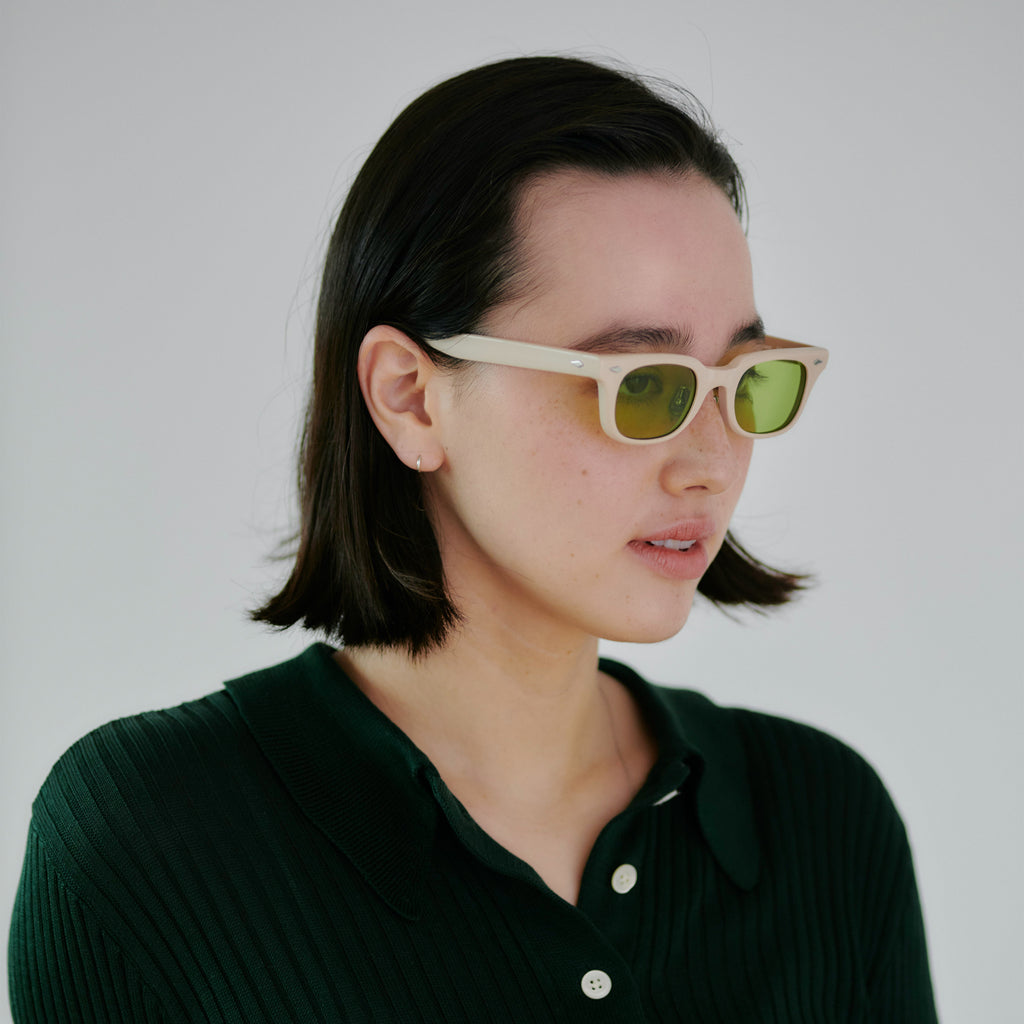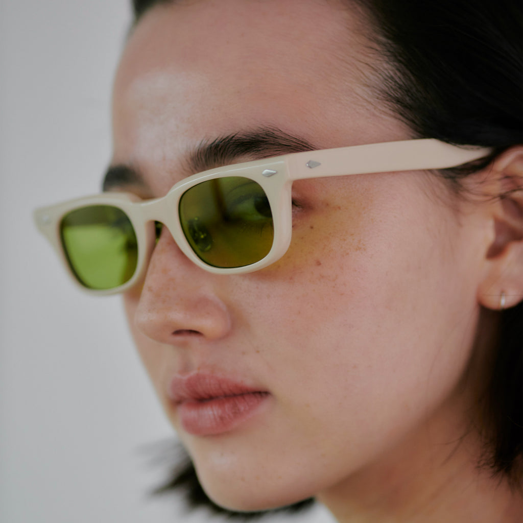 これまでのNOCHINOコレクションの中でも90年代カルチャーのテイストがある上下幅が狭いシェイプながらも普遍的な’’らしさ’’を出す為に6mm厚フロントには程よい「甲丸感/コウマルカン」。ビンテージ界隈でアリとされているフロントとサイドの段差を敢えて行わず、全てを組み立てた後に、さらに磨き合わせる’’面合わせ/ツラアワセ’’という一手間をかける事で繋がりのある一体感と斜めから見た有機的な光沢を具現化。またテンプルと呼ばれる耳に当たる部分の4mm厚のプラステックにはシューティング技法と呼ばれる昔ながらの方法で鯖江の熟練された専属職人が1本1本手作業でメタル芯を内包し、調整や経年変化防止の役目を担っております。